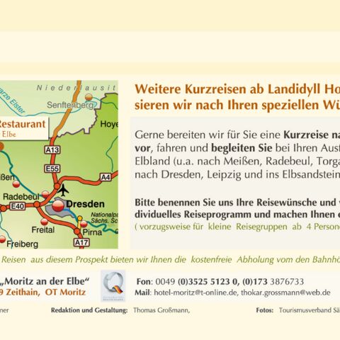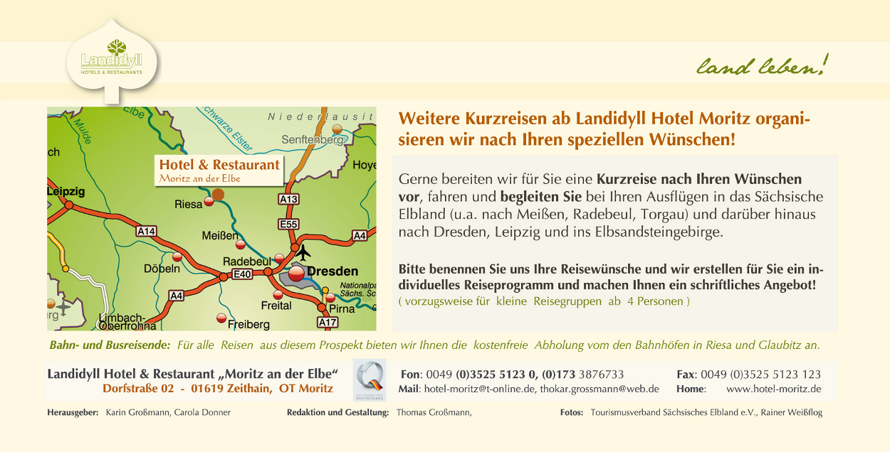 Gerne bereiten wir für Sie eine Kurzreise nach Ihren Wünschen vor, fahren und begleiten Sie bei Ihren Ausflügen in das Sächsische Elbland (u.a. nach Meißen, Radebeul, Torgau) und darüber hinaus nach Dresden, Leipzig und ins Elbsandsteingebirge.
